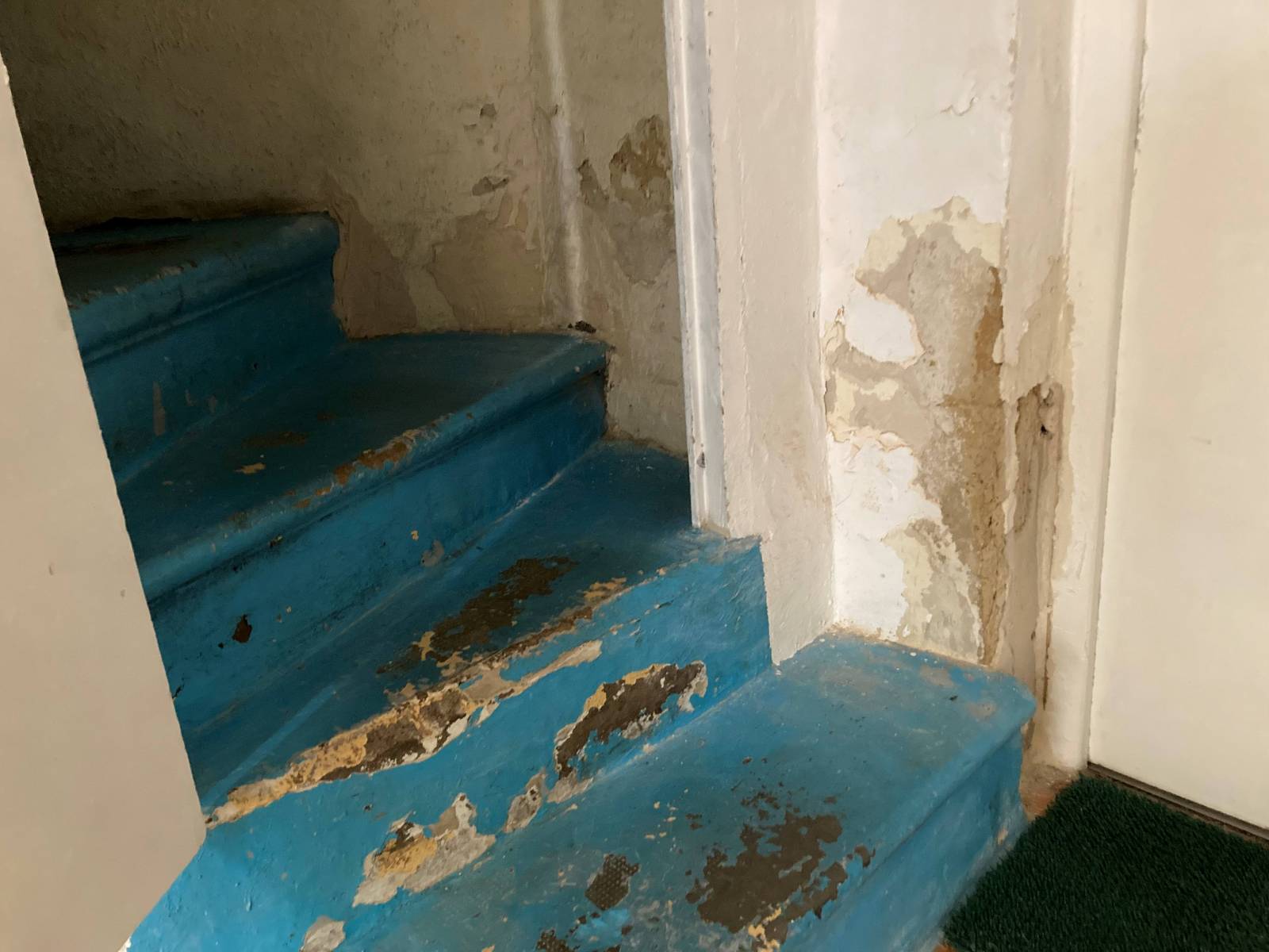 Parties communes d'un immeuble à Castelnau-le-Lez près de Montpellier victime de remontées capillaires qui décollent peintures, plâtres et abiment les marches de l'escalier.
