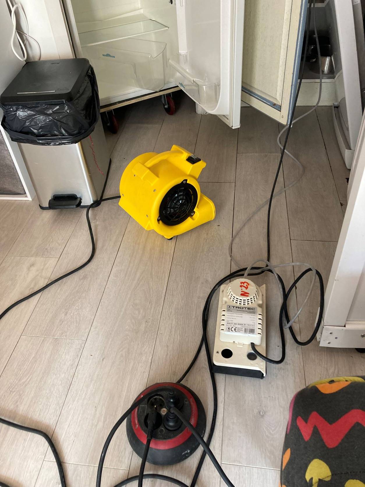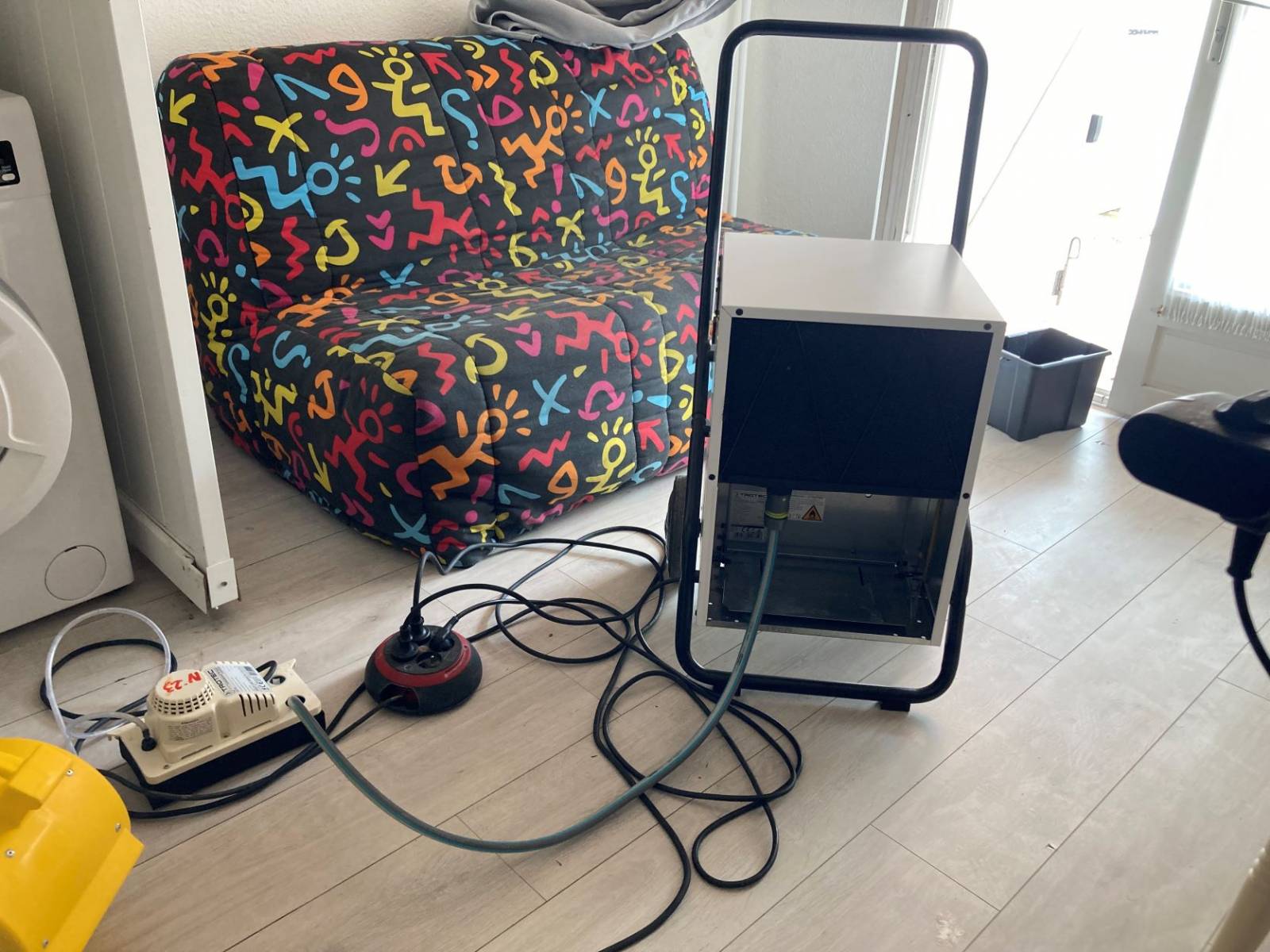Dans ce cas d'inondation de cet appartement de 40 m² à Montpellier, nous avons mis en place une procédure technique d'assèchement comprenant un déshumidificateur professionnel, un ventilateur assécheur des sols ainsi qu'une pompe de relevage.