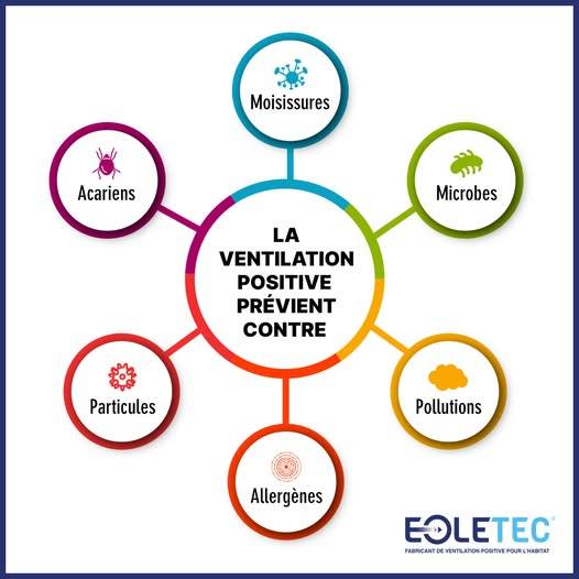 L'installation d'une ventilation positive VPH de chez EOLETEC qui présente l'avantage d'assainir l'air des locaux ou logements par dépollution de l'air entrant en filtrant les particules fines (PP2,5), les pollens et en évacuant les COV dont le formaldéhyde, le radon (gaz toxique issu de la désintégration de l’uranium) ainsi que les excès d'humidité. L’air devient sain et les moisissures disparaissent pour une bonne santé des occupants.