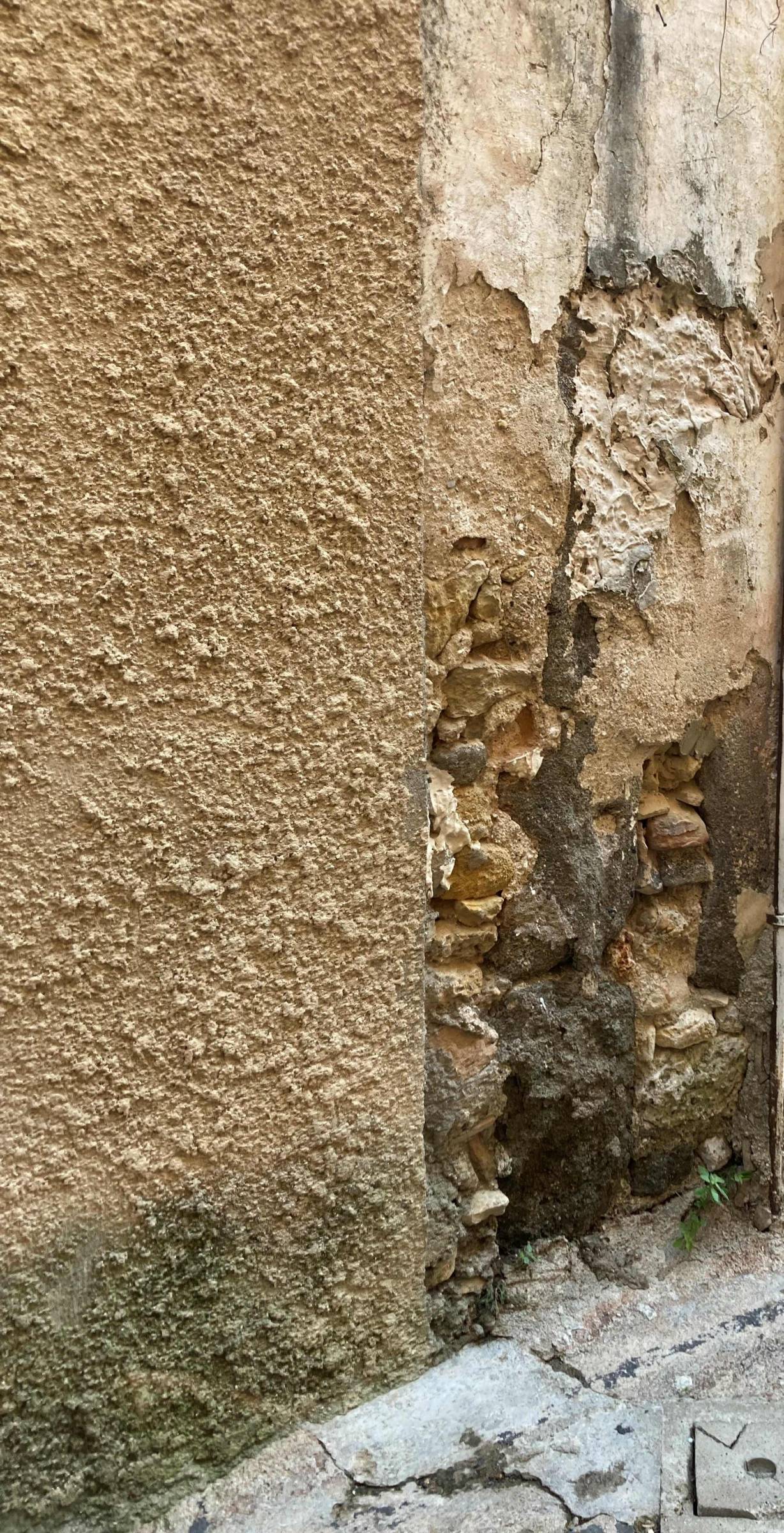 Maison de la périphérie du centre historique de Sommières (30250) dont les murs bâtis en pierres assemblées au mortier maigre, subissent les assauts des remontées capillaires avec l'apparition de moisissures noires et de micro-organismes verts.